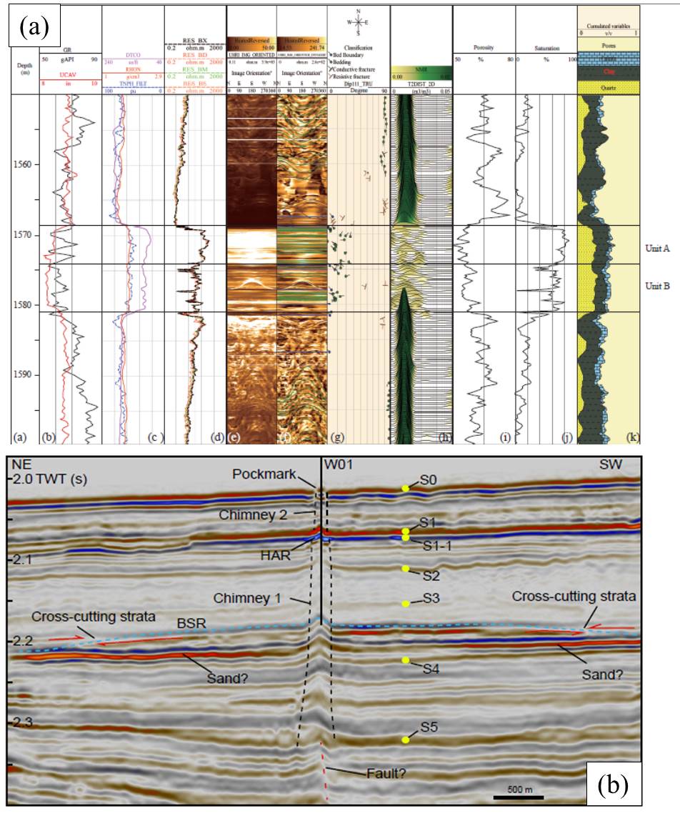 圖1. (a)W01站位測井?dāng)?shù)據(jù)。 圖中方框(Unit A和B)為富含水合物的砂層,砂層上下泥巖層中發(fā)育高角度裂隙,砂層中未發(fā)現(xiàn)垂向裂隙。(b)過W01地震剖面。 S1和S1-1分別為砂層的頂界面和底界面,砂層上下分別發(fā)育兩個氣煙囪。