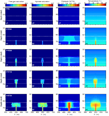 該研究還表明上覆泥層中二次水力壓裂的發(fā)生,須具備特定的超壓與氣體供給條件(圖3)。當(dāng)較低的甲烷通量在進入砂層后迅速形成天然氣水合物,導(dǎo)致孔隙堵塞、滲透率降低,從而引發(fā)自封閉效應(yīng)。該過程抑制了氣體向上部的輸運,致使砂層頂界孔隙壓力無法有效累積至破裂壓力臨界值。這一機制很好地解釋了實際地質(zhì)現(xiàn)象:盡管部分砂層下伏氣煙囪結(jié)構(gòu)發(fā)育,但其對應(yīng)上覆地層中并未形成貫穿至海底的氣體逸出路徑。原因在于低通量條件下氣體運移路徑被天然氣水合物阻斷,超壓體系未能充分發(fā)育,達不到泥巖破裂所需的最小壓力條件。